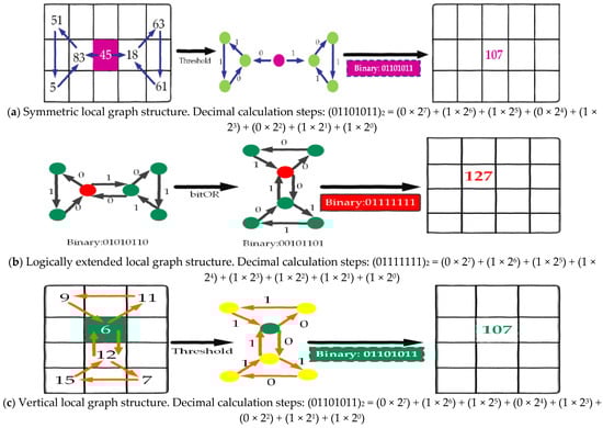 The vertical symmetric local graph structure (VSLGS), which serves as the symmetric model of the VLGS, was introduced by Rakshid et al. [37]. This model employs overlapping blocks of size 5 × 3 in conjunction with the signum function for feature extraction. Figure 3d presents a numerical example that elucidates the operational mechanics of the VSLGS. The primary objective of this model is to enhance the performance of the VLGS by integrating symmetrical properties. The incorporation of 5 × 3 overlapping blocks alongside the signum function facilitates a more comprehensive approach to feature extraction, thereby yielding improved accuracy across a range of tasks. The graphical representation provided in Figure 3d further clarifies the functioning of the VSLGS, offering a specific example that aids in the better understanding and practical application of the model in real-world contexts.