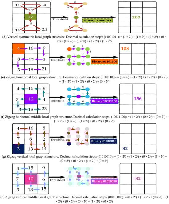 The zigzag horizontal local graph structure (ZHLGS), which employs a horizontally aligned neighborhood block of dimensions 3 × 3, was introduced by Rakshid et al. [38]. An illustrative example of the ZHLGS is presented in Figure 3e.