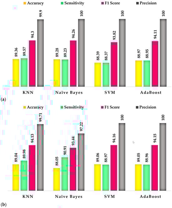 To evaluate the performance of algorithms, several criteria, including accuracy, sensitivity, precision, and F1 score, were employed [44]. These criteria facilitate a comprehensive assessment of classifier performance from multiple perspectives, allowing for a reliable and accurate comparison of results. Accuracy is defined as the ratio of correct predictions made by the model comparison to the total number of predictions, thereby indicating the percentage of instances in which the model has accurately forecasted outcomes (see Equation (7)) [44].
