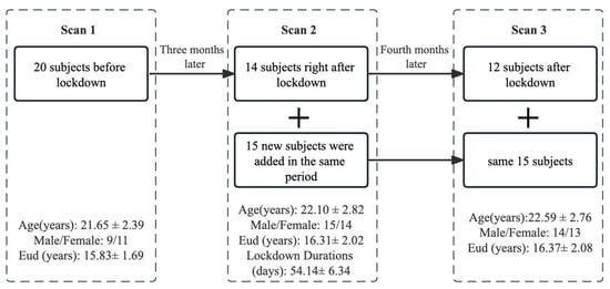 A total of 20 healthy participants aged 18–27 were recruited from ShanghaiTech University. Prior to the COVID-19 lockdown, participants underwent an initial MRI scan (Scan1). Three months later, participants experienced a full lockdown, which involved restricted physical and social activities under strict quarantine protocols, including confinement in dormitory conditions for approximately two months. Following the two-month lockdown, 29 participants (14 original and 15 new) were recruited for a second MRI scan (Scan2, two months after the lockdown) to examine the effects of the lockdown. During the lockdown period, we used online advertising and communication channels to reach individuals who had expressed interest in the study, and these 15 new participants were recruited. Following the lifting of the lockdown measures, 27 out of the 29 participants underwent a follow-up MRI scan (Scan3) four months later to examine the potential long-lasting effects. Participants were included if they did not have a history of significant head injury, neurological diseases, mental disorders, or significant medical conditions such as hepatic or renal diseases, or severe cardiovascular, and if they did not have standard MRI contraindications such as current pregnancy, metal implants, breastfeeding, or claustrophobia.