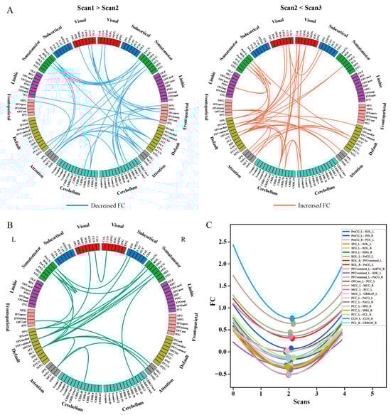 Figure 3A showed the results of the pairwise group comparisons for whole-brain FC. A subnetwork using the NBS approach (p < 0.05, 5000 permutation test, Figure 3A) was identified that demonstrated a decrease in FC at Scan2 compared to Scan1. The primary decrease in FC was observed between the attention network (ATN) (including bilateral superior occipital gyrus (SOG), median cingulate and paracingulate gyri (MCC), right supramarginal gyrus (SMG), and left supplementary motor area (SMA)) and the somatomotor network (SMN) (including bilateral precentral gyrus (PreCG), postcentral gyrus (PoCG), rolandic operculum (ROL), and right left paracentral lobule (PCL)), between visual network (VIS) (cuneus (CUN), lingual gyrus (LING), and fusiform gyrus (FFG)) and frontoparietal network (FPN) (including the right middle frontal gyrus (MFG), inferior parietal gyrus (IPG), and inferior frontal gyrus of opercular part (IFGoperc)), within ATN, and within SMN. Similarly, a subnetwork was identified (Figure 3B) that showed an increase in FC at Scan3 compared to Scan2. The primary increased FCs were observed between the default network (DMN) (including bilateral posterior cingulate gyrus (PCC), anterior cingulate and paracingulate gyri (ACC), and left superior frontal gyrus of medial orbital (PFCventmed)) and visual network (bilateral CUN, SOG, left LING, and right calcarine cortex (CAL)), SMN (including bilateral PoCG, left PreCG, ROL, PCL), and ATN. There were no group differences between Scan1 and Scan3.