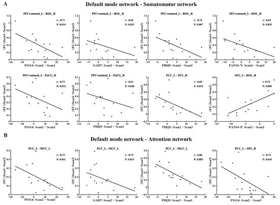 As shown in Figure 4, the absolute values of FC changes (Scan1–Scan3) between the DMN (including left PFCventmed, PCC, and SFG) and the SMN (including right ROL, PoCG, and PCL) showed a negative correlation with the improvement in mental status measurements such as PSS14, GAD7, PHQ9, and PANAS-N (positive correlation with improvement in PANAS-P), suggesting the greater proximity of FC in the third scan to baseline is associated with better symptom recovery (Figure 4A). Similarly, the absolute values of FC changes (Scan1–Scan3) between the DMN (including left PCC) and ATN (including left MCC and right SPG) showed a negative correlation with the improvement in mental status measurements in PSS14, GAD7, and PHQ9 (Figure 4B).