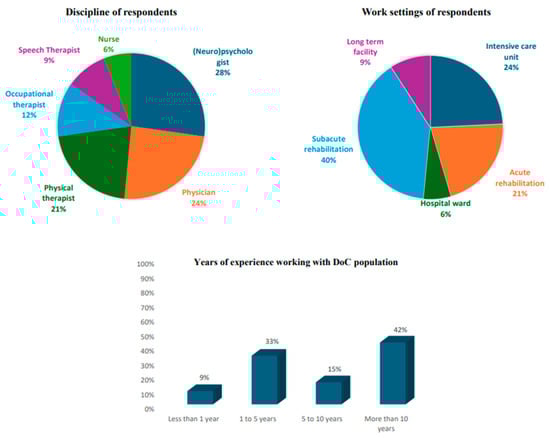 Respondents were (neuro)psychologists (n = 9; 27.3%), physicians (n = 8; 24.2%), physical therapists (n = 7; 21.2%), occupational therapists (n = 4; 12.1%), speech therapists (n = 3; 9.1%), and nurses (n = 2; 6.1%) (see Figure 1). The majority of respondents (n = 24; 72.7%) reported working exclusively with the adult DoC population while only 6.1% (n = 2) were working with the pediatric population, and the remaining 21.2% (n = 7) indicated working with both groups.