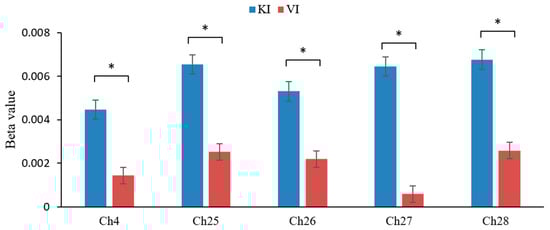 Beta values of cortical channels with significant activation differences between two groups (* p < 0.05).