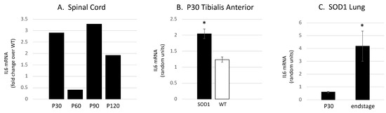 Initial muscle denervation occurs in the TA muscle (fast-fatigable and fatigue-resistant fibers) between P14 and 30, while little denervation occurs in the soleus muscle (slow and fatigue-resistant fibers) even late in ALS progression [24,25]. Interestingly, while glial activation is observed shortly after the initial NMJ denervation, robust microglia and astrocyte activation is not observed until later in ALS progression e.g., see [23,24,25,33]. In this study, we identified increased IL6 expression in the TA muscle coincident with early NMJ denervation, increased expression in the spinal cord that appears to parallel microglial activation and increased expression in lung tissue at end-stage in the SOD1G93A mouse model (see Figure 2).