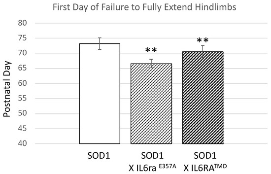 Overt motor deficits appear earlier in ALS SOD1G93A mice with enhanced IL6 trans-signaling. Animals were monitored three times/week beginning at postnatal day 50. The SOD1 X Il6raE357A and SOD1 X Il6raTMD mice failed to fully extend their hindlimbs for greater than two seconds earlier than SOD1 animals. Shown is the first day when animals failing to reach this milestone was recorded (mean + SEM, SOD, n = 28; 8F; 20 M; SOD X Il6raE357A, n = 74; 33F, 41 M, 19 hm, 55 ht; SOD1 X Il6raTMD, n = 35, 11 F, 24 M, 11 hm, 24 ht). Statistical analysis was performed using one-way ANOVA followed by Bonferoni post hoc test. ** p < 0.01. No differences within genotypes between male and female or between heterozygous or homozygous were detected.