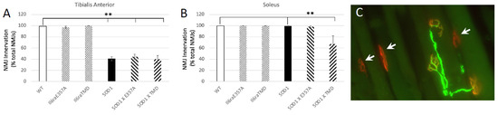 For counting innervated hindlimb skeletal muscle NMJs, an immunohistochemistry was performed on soleus and tibialis anterior (TA) muscles as described previously [19,23,24,33]. The muscles were embedded in OCT and cut at 35 μm on the cryostat. To identify axons and presynaptic terminals, the sections were processed for immunohistochemistry for neurofilament light chain (1:1000, rabbit anti-NF-L; Novus NB300-135) and vesicular acetylcholine transporter (1:400, rabbit anti-VAChT; Invitrogen PA5-77386). After extensive washing in PBS, appropriate Alexa-fluor donkey anti-rabbit secondary antibodies (1:500, Invitrogen) were used for the detection of the primary antibodies. To identify postsynaptic terminals, sections were also labeled with Alexa-fluor–alpha-bungarotoxin (1:500 Invitrogen B13422 (488) or B13422 (555) [34]. NMJs that exhibited an overlap of red and green were considered innervated, while those that exhibited only α -BTX expression were considered denervated. All NMJs in every 30 μm section were analyzed. The percentage of innervated NMJs was determined in each treatment group using previously established counting criteria [23]. Tissue sections from both WT and SOD1G93A mice were processed simultaneously during the immunohistochemistry.