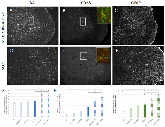 To begin to determine differences in pathological events that may account for the earlier symptom onset, we also focused on glial activation, as increases in CSF IL6 were unique to ALS patients vs. healthy or disease controls [5], and in the clinical trial treating ALS patients with the IL6R inhibitor tocilizumab (TCZ), only individuals inheriting the Ala358 variant and treated with TCZ showed decreases in CSF c-reactive protein (CRP), a marker of inflammation [8]. We examined “glial activation” as determined by an increased expression of GFAP for astrocytes. For microglial activation, we determined IBA1 expression together with CD68 (ED1), as we have found this to remain the most reliable measure, immunohistochemically, of activated microglia [36,37]. There was an increased expression of all glial markers in SOD1 X Il6raE357A/E357A and SOD1 X Il6raTMD/TMD as compared to SOD1 at P80 (Figure 5). Microglial “activation”, as determined by an increased expression of IBA and CD68, was increased in SOD/trans-signaling crosses (SOD1 X Il6raE357A; SOD1 X Il6raTMD) as compared to SOD1 animals. Astrocyte activation, as determined by an increased expression of GFAP, was increased in SOD/trans-signaling crosses (SOD1 X Il6raE357A; SOD1 X Il6raTMD) as compared to SOD1 animals, indicating that IL6 trans-signaling is an important factor in astrocyte activation. Interestingly, although reduced when compared to their SOD1 counterparts, the Il6raE357A/E357A and Il6raTMD/TMD mice showed an increased immunohistochemistry for GFAP (astrocytes) as compared to WT animals, suggesting, as previously shown [1], that glial cells may be primed by IL6R trans-signaling even with physiological levels of IL6.