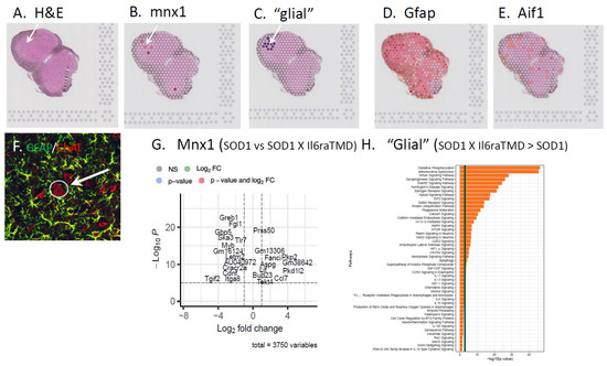 To begin to investigate if there is a specific, IL6 trans-signaling-mediated glial response and if spinal MNs have unique responses in conditions of trans-signaling, we used a discovery-level whole transcriptome-based spatial RNAseq analysis of the ventral, lateral lumbar spinal cord of SOD1 and SOD1 X Il6raTMD mice. The overall cytoarchitecture and cells exhibiting MN phenotypes were identified by H&E staining and the image capture of sections prior to RNA isolation (A). (B) Individual 55 um diameter analysis spots containing MNs were identified by the expression of the mnx1 (HB9; [38]) and mnx1-negative, GFAP and/or Aif1 (IBA1) surrounding glial spots selected (C–E). (F) Photomicrograph of an adjacent spinal cord section processed by double-label immunofluorescence for ChAT to identify MNs (red) and GFAP to identify astrocytes (green) in the same MN-enriched region as shown in (A) (arrows in (A,F)). (G) The enhanced volcano plot indicates the extent of differential gene expression between MNs of SOD1 vs. SOD1 X Il6raE357A mice. (H) Pathway analysis was performed and identified IL6 trans-signaling-specific pathways associated with glial responses at P80 in SOD1 X Il6raTMD mice.