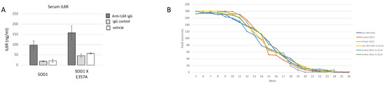 In the tocilizumab (Actemra®) clinical trial in ALS, tocilizumab was found to be safe but did not alter ALS progression. The absence of an effect on ALS progression was perhaps because of the short duration of the study and/or the selection of screening biomarkers. Increases in sIL6R were observed in all tocilizumab-treated patients, likely reflecting the altered catabolism of the sIL6R/IL6/tocilizumab complexes as reported in other patient populations treated with the drug [59]. We observed similar results in the mouse models, where treatment with a mouse equivalent antibody to IL6R failed to affect the onset of overt motor deficits and overall survival (see Figure 7). Interestingly, increases in soluble IL6R were also observed in mice treated with antibody. While it is tempting to conclude that these treatment approaches are not beneficial, it remains unknown, and indeed unlikely, that the functional blocking antibodies are reaching the target areas in the spinal cord or cortical parenchyma in sufficient concentrations to be effective (see [60,61,62,63]).