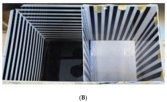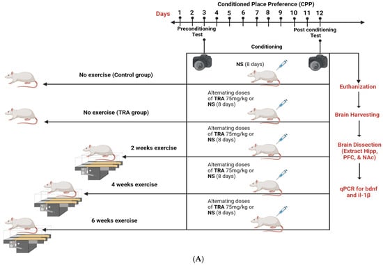 All experimental procedures were approved by the Institutional Animal Care and Use Committee at Yarmouk University (IACUC/2022/8), dated 4 September 2022. Male Sprague Dawley (SD) rats (240–260 g) were obtained from the animal house of Yarmouk University. Animals were housed under standard laboratory conditions: temperature of 21–25 °C, 55% humidity, and a 12 h light–dark cycle. Each rat was housed alone in a 45 cm × 30 cm × 20 cm cage with wood shaving bedding and no environmental enrichment. Rats had free access to water and a standard chow diet. Rats were divided into five groups with 10 rats in each group: the control group received normal saline and underwent the CPP paradigm; the TRA–saline group received alternating doses of TRA (75 mg/kg i.p.) and saline injections for 8 days during the CPP paradigm; and three exercise groups were forced to run on a treadmill for 2, 4, or 6 weeks (60 min/day, 5 days/week) before undergoing CPP testing, and then each group received alternating doses of TRA (75 mg/kg i.p.) and saline injections for 8 days during CPP testing, as reported in previous studies [28,29]. TRA (Hikma Pharmaceuticals, Amman) was dissolved in saline and was given intraperitoneally (75 mg/kg i.p.). This was an effective dose for CPP based on another study [30]. The experimental design is shown in Figure 1A and the conditioning place preference apparatus in Figure 1B.