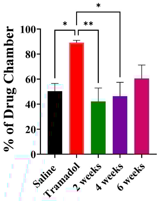 Percentage of time in the drug-paired chamber; after saline, tramadol (75 mg/kg × 4 days), and tramadol following 2, 4, or 6 weeks of forced exercise. Data are expressed as mean ± S.E.M. n = 10, * p < 0.05, ** p < 0.01.