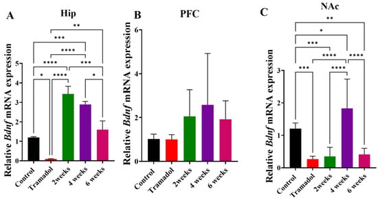 Relative mRNA expression of Bdnf in (A) hippocampus (Hip), (B) prefrontal cortex (PFC), and (C) nucleus accumbens (NAc) after tramadol treatment alone or in combination with 2, 4, or 6 weeks of physical exercise. Data are expressed as mean ± SEM (n = 5); * p < 0.05, ** p < 0.01, *** p < 0.001, **** p < 0.0001.