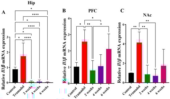 Relative mRNA expression of Il-1β in (A) hippocampus (Hip), (B) prefrontal cortex (PFC), and (C) nucleus accumbens (NAc) brain regions after tramadol treatment alone or in combination with 2, 4, or 6 weeks of physical exercise. Data are expressed as mean ± SEM (n = 5); * p < 0.05, ** p < 0.01 and **** p < 0.0001.