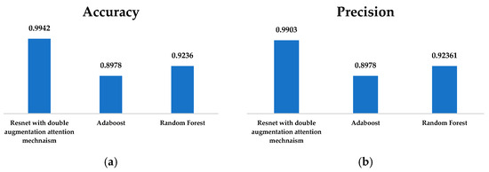 (a) Accuracy and (b) precision of ResNet with Double Augmentation Mechanism, AdaBoost, and Random Forest Classifier.