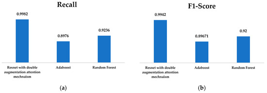 (a) Recall; (b) F1-Score of ResNet with Double Augmented Attention Mechanism, AdaBoost, and Random Forest Classifier.