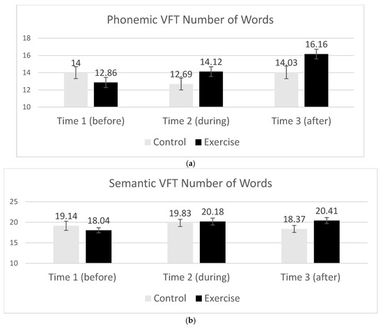 There was no overall three-way interaction of the test type, time of test, and experiment group (F < 0.257) on the number of words produced. However, there was an interaction of the time of test and experiment group on the number of words produced (F(2, 164) = 4.55, p = 0.012, ηp2 = 0.053) in which participants who were exercising during the VFT produced more words over time. Interestingly, exercising participants produced more words in the VFT after (M = 18.65) and during (M = 17.2) exercise compared to before exercise (M = 15.5; t(50) = 4.41, p < 0.0001; t(49) = 2.53, p = 0.015, respectively). There was a marginal difference in the number of words produced after exercise compared to during exercise (t(49) = 1.85, p = 0.07). In contrast, the participants in the control group did not change the number of words produced over time. This general pattern was the case for both the phonemic and semantic tests and is reflected in Figure 2a,b. There was also an interaction of the test type and time of test on the number of words produced (F(2, 164) = 3.72, p = 0.026, ηp2 = 0.043) in which participants produced more words in the semantic than in the phonemic tests, overall, with this difference being most pronounced in the VFT that occurred during the middle of the session. These values can be seen in Figure 2a,b.