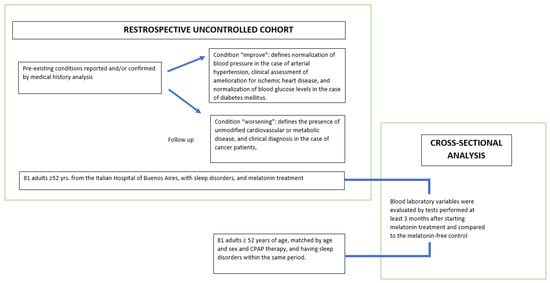 Study design illustrating the retrospective uncontrolled cohort of 81 adults with sleep disorders treated with melatonin at the Italian Hospital of Buenos Aires, where pre and post treatment assessments were used to evaluate improvement or worsening of preexisting conditions. The design also includes a cross-sectional comparison of post-treatment laboratory variables with an age, sex, and CPAP therapy matched control group.