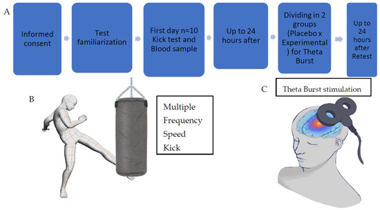 Study design. (A) Study fluxogram. (B) Design of MFSKT (using low kick adapted to MMA, athletes were instructed not to rotate the support foot; all kicks were recorded via video, and trials in which foot rotation was detected were repeated to ensure standardization; also, the video recordings were used to ensure accurate kick counting). (C) Design of theta-burst stimulation. Images created by the author using Canva.com.
