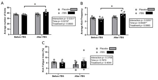 Average kicks of each test after and before theta-burst intervention. (A) Differences in the mean number of kicks in the MFSKT pre- and post-intervention with intermittent theta-burst stimulation. (B) Mean kick frequency in the Progressive Kick Test for the iTBS and placebo groups. (C) Kick Fatigue Index as a percentage of kicks pre- and post-intervention with iTBS. Results are expressed as mean ± standard deviation. * p < 0.05. ** p < 0.01.