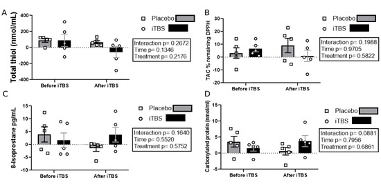 Regarding plasma oxidative-stress biomarkers, no significant changes were observed for plasma thiol levels (Figure 4A), total antioxidant capacity (Figure 4B), 8-isoprostane levels (Figure 4C), and carbonylated protein (Figure 4D).