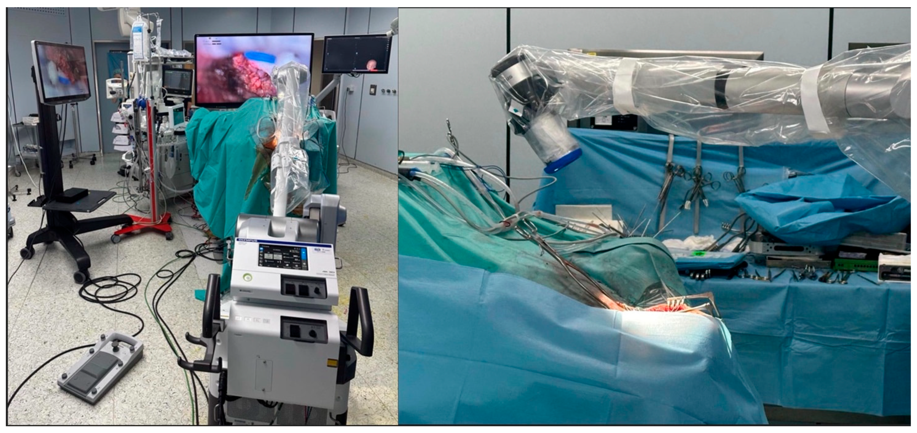 Several limitations of our study warrant consideration. It was conducted at a single center with a retrospective design, a small sample size, and limited follow-up, which may constrain generalizability, reduce precision, and preclude definitive conclusions about long-term outcomes and complications. Selection and information biases are possible, and unmeasured confounders may remain despite consistent operative workflows. With these caveats, our findings suggest that exoscopy may be particularly advantageous in cases where surgeon ergonomics and shared visualization can influence performance—such as deep-seated or awkwardly angled surgical approaches, lengthy resections, and teaching settings requiring real-time team situational awareness. The enhanced 3D 4K visualization and flexible angulation also appear useful when wide-angle inspection and frequent line-of-sight adjustments are needed. These clinical implications should be considered hypothesis-generating; validation in larger, multicenter cohorts with longer follow-up is warranted.