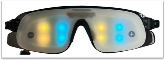 Example of color presentation through a commercial audiovisual entrainment (AVE) device. The device consists of eight light-emitting diodes (LEDs), with four LEDs positioned for each eye. For each eye, two LEDs target the left visual field and two LEDs target the right visual field. In this configuration, the left visual field is illuminated with yellow light, and the right visual field is illuminated with blue light. The colors shown are representative of a common experimental setup; yellow and blue were selected because different wavelengths can evoke distinct physiological and psychological responses, as reported in prior research [44,45,46].