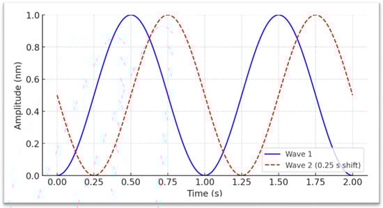 Depiction of two sinusoidal waveforms with amplitudes scaled from 0 to 1 nanometer (nm) and no interval between the flickers, allowing direct interpretation of displacement as a positive physical quantity. The blue solid waveform is phase-aligned to begin at (0 s, 0 nm), where it gradually rises to its peak in a smooth curve before descending back toward its minimum, forming a continuous oscillatory cycle characteristic of sinusoidal motion. The red dashed waveform is offset by 0.25 s relative to the blue waveform, illustrating a constant phase difference between the two signals. This phase arrangement could be applied to stimulate the right visual field of both eyes and the left visual field of the right eye, with the aim of selectively engaging the left and right brain hemispheres.