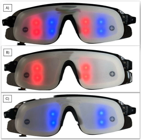 Audiovisual Entrainment devices in the market typically incorporate lights of varying colors, as illustrated in Figure 1. A substantial body of research supports that color influences individual mood and behavior and elicits distinctly varied effects based on the specific hue [42,43,44]. For instance, studies have documented how different colors can induce different psychological responses, ranging from calming effects with blue to stimulating effects with red [45,46,47]. Moreover, the interaction between color and brain function extends beyond subjective psychological effects to quantifiable changes in brain activity. Münch [48] has shown that various colors can distinctly influence brain wave patterns. This evidence implies that the selection of colors in AVE devices could be deliberately tailored to engage specific neural rhythms linked with desired psychological states. These studies have important implications for the design and application of AVE devices. By understanding the nuanced effects of color on both psychological and neurophysiological levels, manufacturers can enhance the efficacy of AVE technologies. This suggests that, since different colors exert distinct psychological and neurophysiological effects, the choice of color in AVE studies should be made purposefully in line with the specific aims of the experiment. While we have highlighted some general differences in psychological responses (e.g., calming versus stimulating effects), researchers are encouraged to consult the existing literature in detail prior to study design to ensure that color selection is aligned with the intended outcomes.