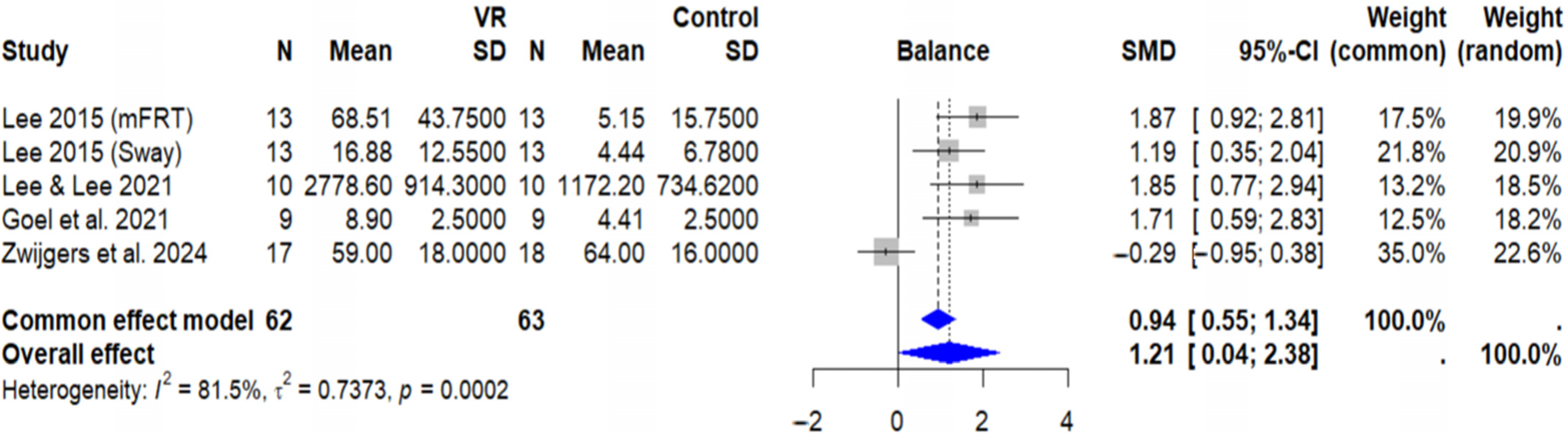 - Balance outcomes (5 studies, n = 125 participants): A meta-analysis was conducted on studies reporting outcomes such as the modified Functional Reach Test (mFRT), Limits of Stability (LOS), and postural sway measurements.