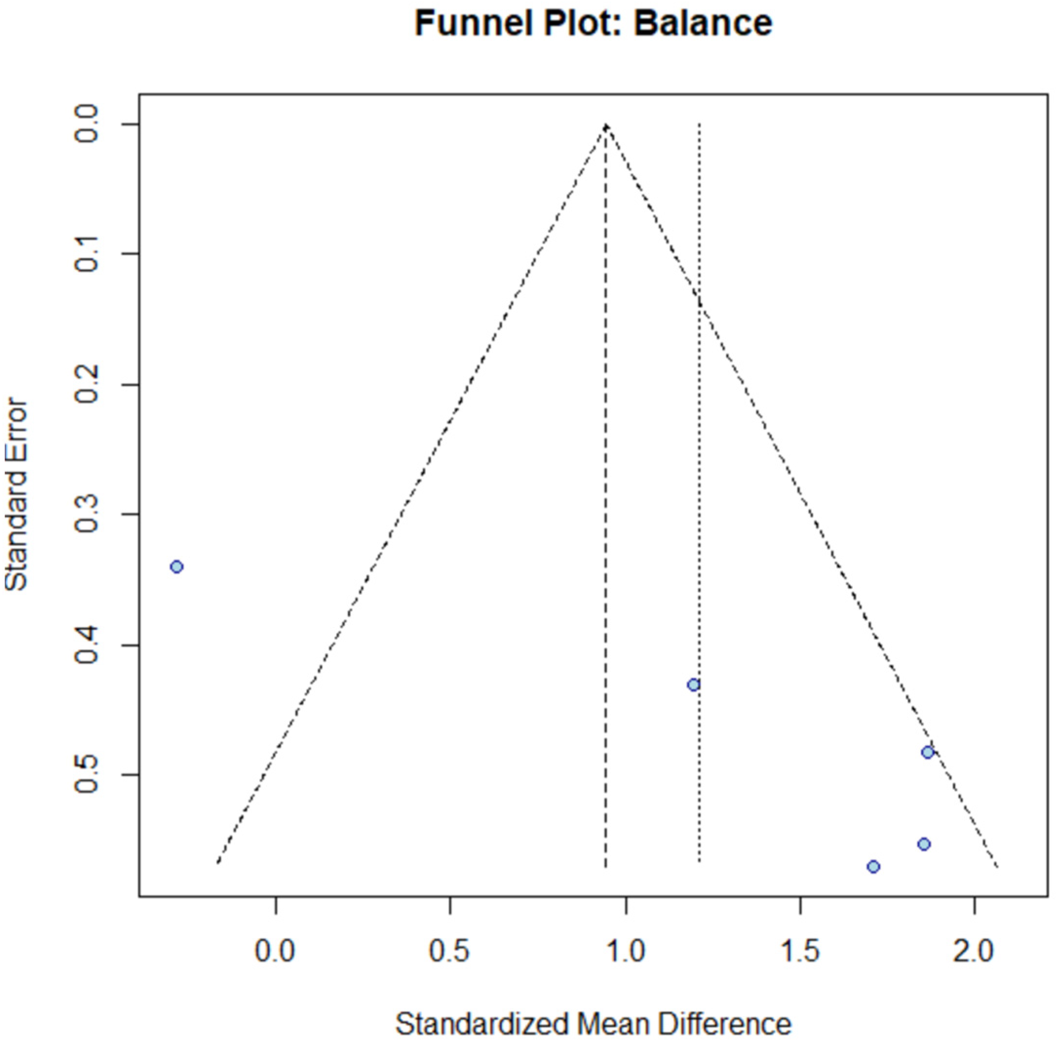 3.6.2. Assessment of Publication Bias for Balance Outcomes