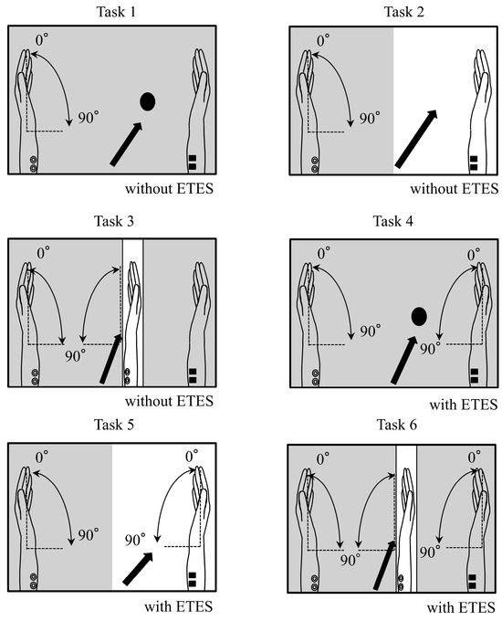 Before the main experiment, participants practiced while receiving electromyography-triggered electrical stimulation to the right wrist flexors, with the trigger derived from left forearm activity, so that the induced right-wrist movement occurred in synchrony with voluntary left-wrist flexion. During the experiment, participants were instructed to keep the right upper limb relaxed in all conditions. In Tasks 1–3, the right hand was kept completely still. In Tasks 4–6, right-hand motion was produced only by electrical stimulation; participants were explicitly instructed not to move the right hand voluntarily.