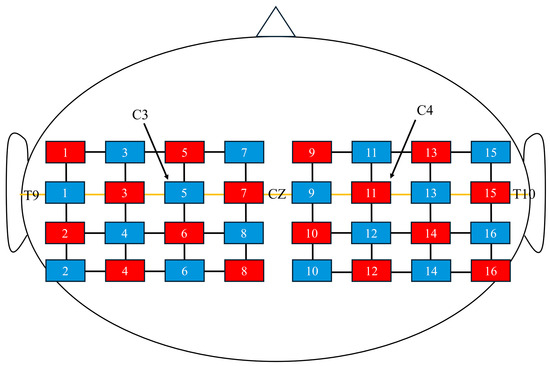 Figure 2. Near-infrared spectroscopy channel configuration. Red squares represent optical sources, and blue squares represent detectors. The midline (orange line) corresponds to the T9–Cz–T10 line. C3 and C4 indicate the standard 10–20 system electrode positions for reference.