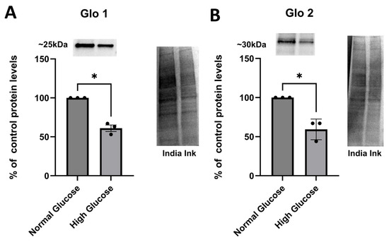 Western blot analysis of Glo1 and Glo2 protein levels in normal and hyperglycemic conditions. Astrocytes were plated in normal (300,000 cells/well) (5 mM)- and high (25 mM)-glucose conditions (300,000 cells/well) for 2 weeks. (A). Glo 1 protein expression was significantly reduced in astrocytes cultured in high-glucose conditions when compared to the control (−39.00% in relation to control ± 4.163 SEM, n = 3). (B). Glo2 protein expression was significantly reduced in astrocytes cultured in high-glucose conditions when compared to the control (−40.67% in relation to control ± 7.667 SEM, n = 3). Quantification was normalized utilizing India ink (* p < 0.05).