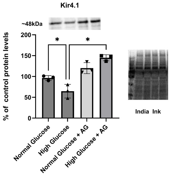 Western blot analysis of Kir4.1 protein levels in normal and hyperglycemic conditions: Effect of aminoguanidine (AG). Astrocytes were grown in normal conditions (300,000 cells/well), 5 mM (normal glucose), and in hyperglycemic conditions (300,000 cells/well), 25 mM (high glucose). After 2 weeks, astrocytes were treated with 9 mM of AG for 24 h (normal glucose + AG; high glucose + AG, 300,000 cells/wells). Kir4.1 protein expression is downregulated in high-glucose conditions; however, when treated with AG for 24 h, there is significant recovery in the protein expression of Kir4.1 in astrocytes, specifically those cultured in high-glucose conditions with AG when compared to astrocytes cultures grown without AG (p = 0.0001, 95% C.I [−109.3 to −51.01]). Quantification was normalized utilizing India ink (* p < 0.05).