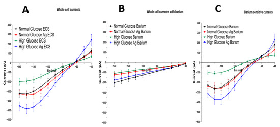 Astrocytes were clamped at holding potential (Eh) equal to the resting membrane potential (Em) in 3 mM [K+]o. Therefore, the difference between Eh and Em gives zero voltage gradient at the membranes of astrocytes and, consequently, zero current, which prevents both the accumulation and release of potassium and other ions from the cells. Barium in micromolar concentration is a blocker of Kir4.1 currents; however, in a millimolar concentration it may also partially depress 2P channel currents [33]; therefore, we used low-dose barium. We evaluated the effects AG had on inward-rectifying currents when they were blocked by a low dose of barium, a specific Kir-channel blocker. The current I/V-curves of the astrocytes are shown in Figure 3, which were obtained via a voltage step protocol: voltage increased in 10 mV increments from −140 mV to −40 mV, at 70 mV below and 100 mV above the holding potential. Figure 3A shows whole-cell currents recorded from astrocytes grown in (i) normal glucose (n = 24), (ii) normal glucose treated with AG (n = 32), (iii) high glucose (n = 25), and (iv) high glucose treated with AG (n = 27). We observed that astrocytes cultured in high-glucose conditions have significantly smaller cell currents when compared to the controls (Figure 3A). Hyperglycemia results in strongly diminished cell currents.