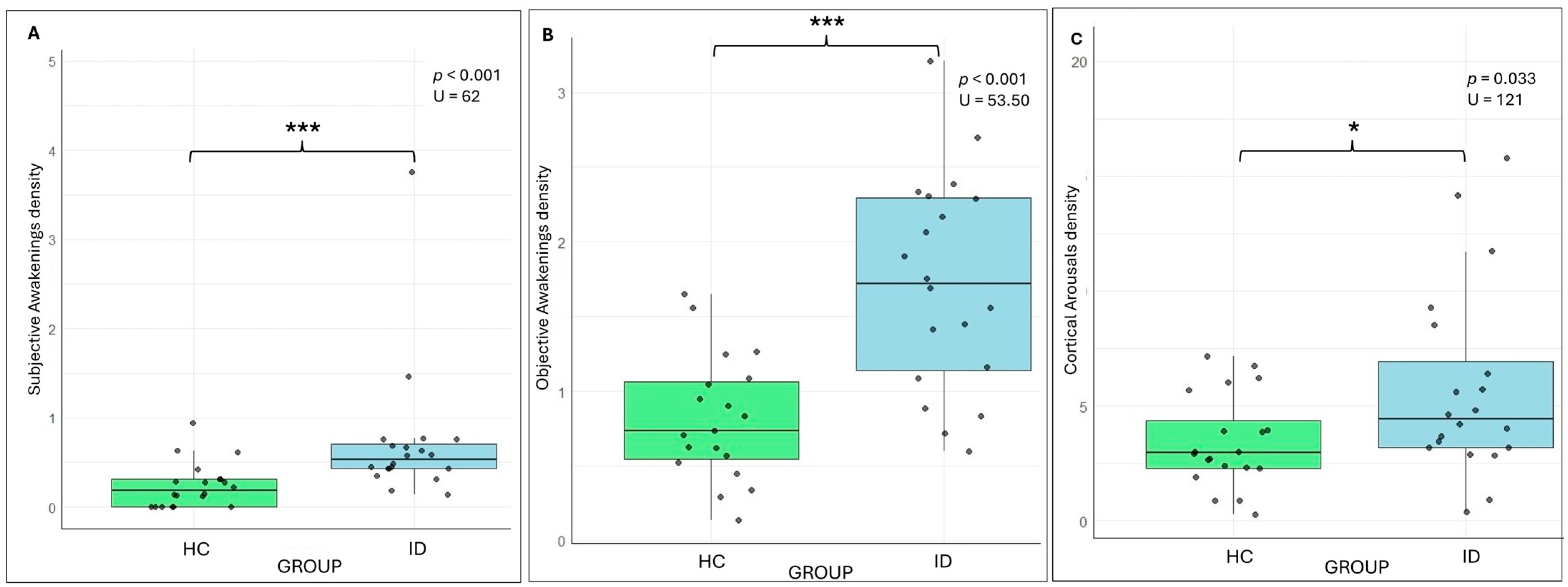 HC Means ± SD (N = 20) | ID Means ± SD | U-Test | p-Value | |