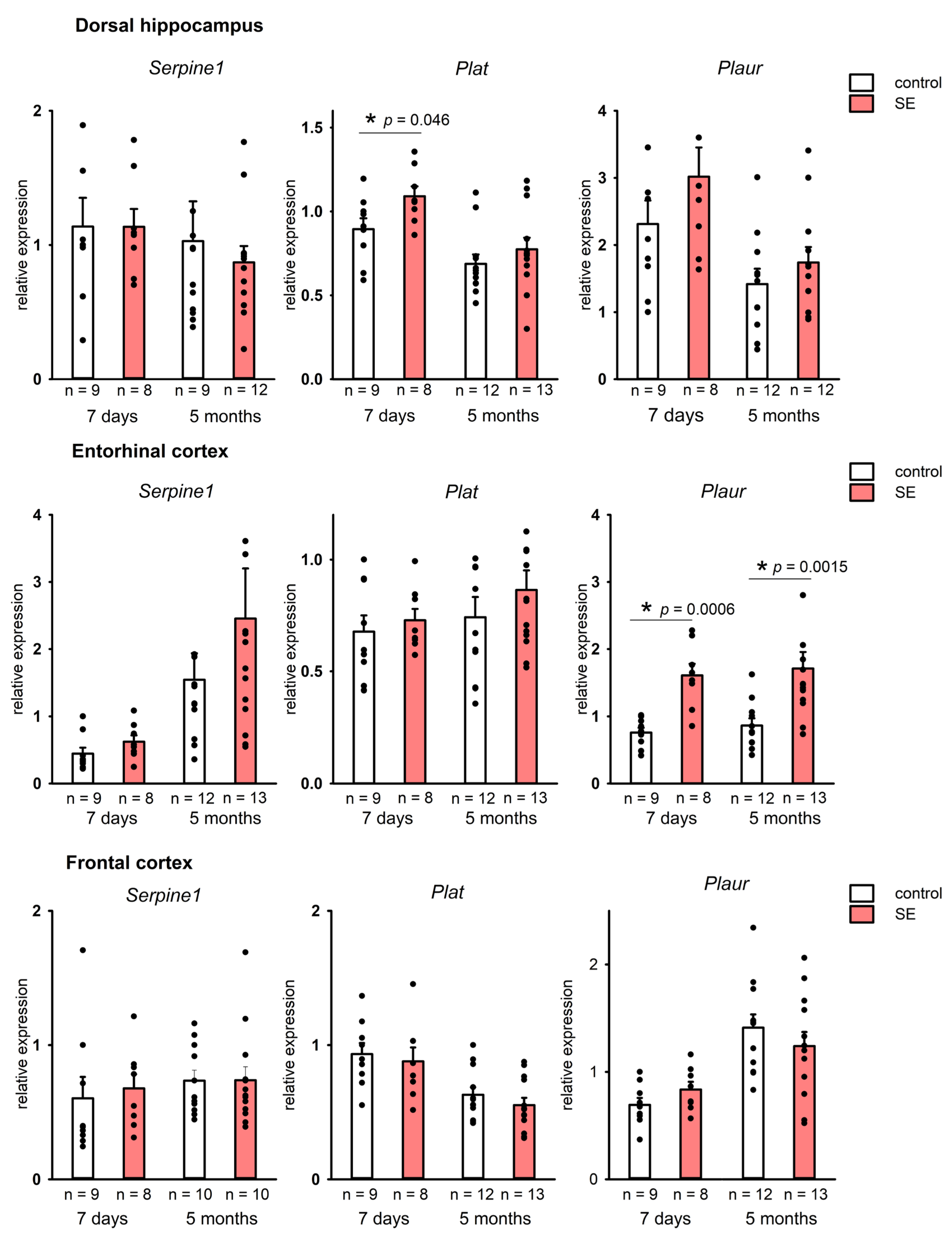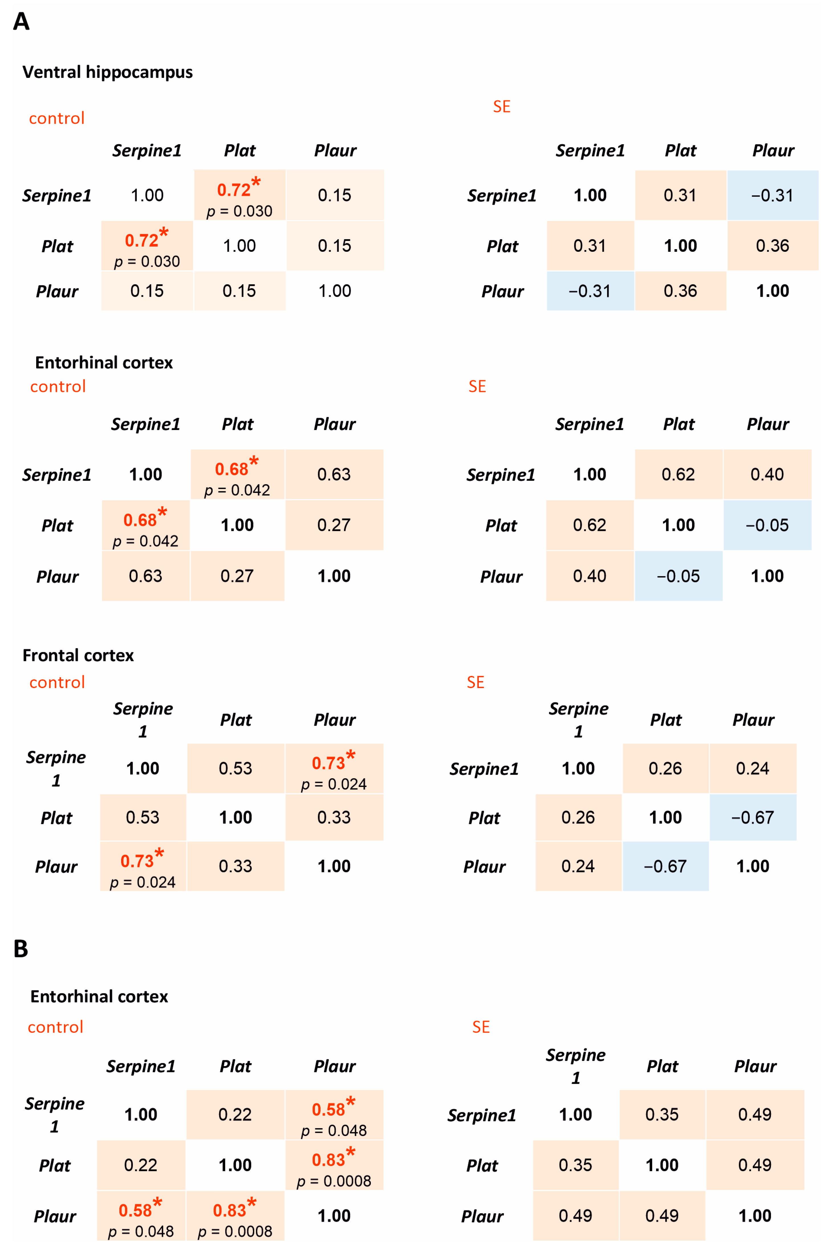 3.2. Expression of Serpine1, Plat, and Plaur in the Hippocampus, Entorhinal Cortex, and Neocortex