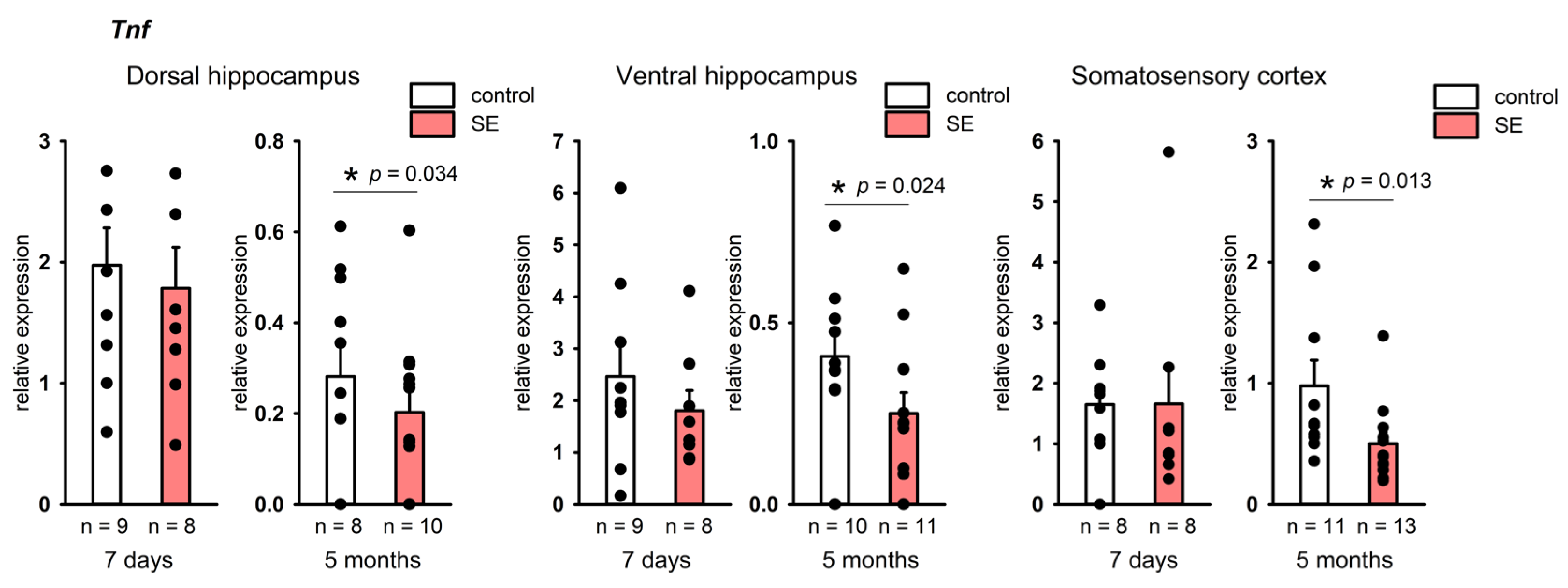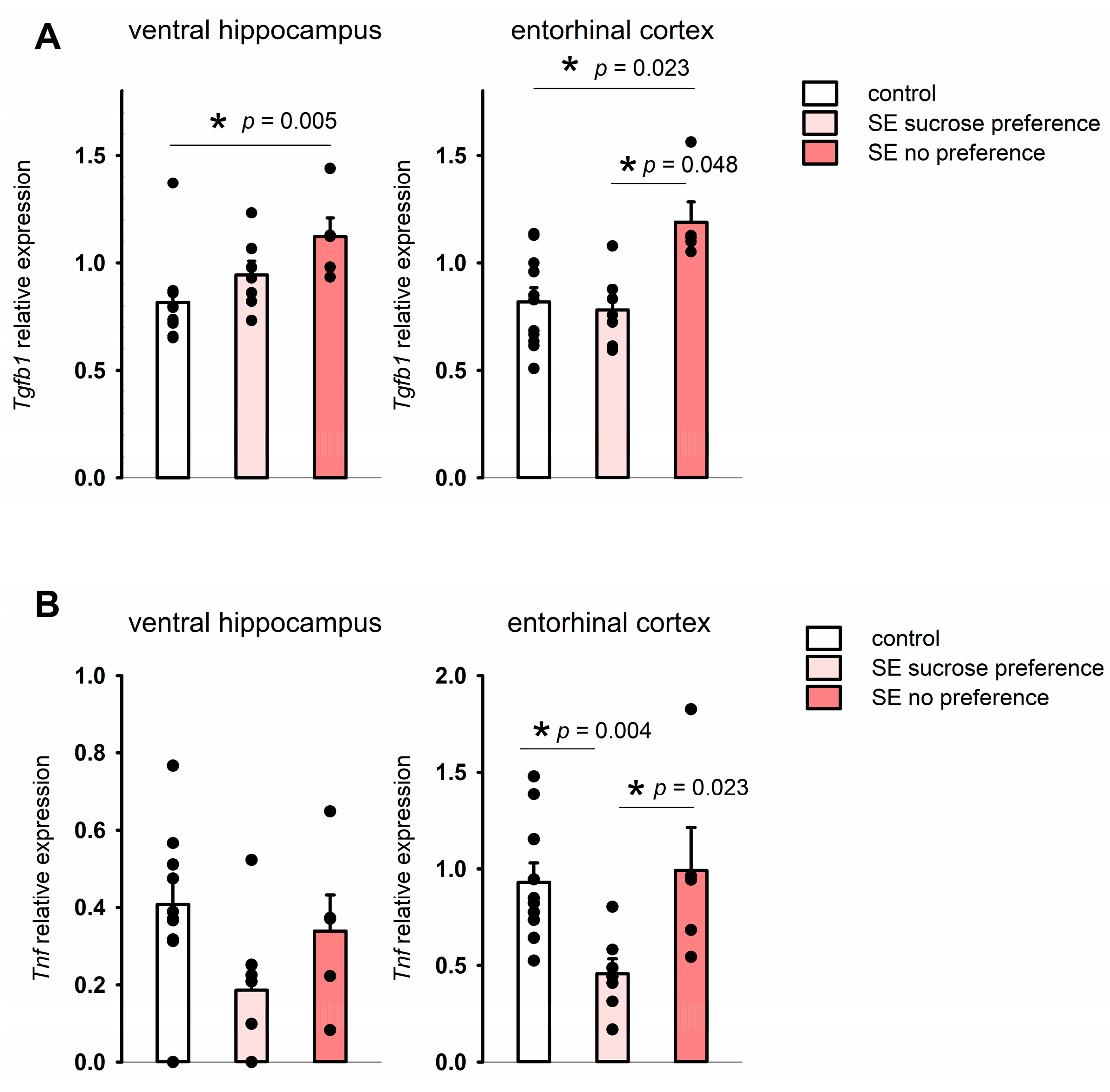 3.3. Expression of Il1b, Tnf, and Tgfb1 in the Hippocampus, Entorhinal Cortex, and Neocortex