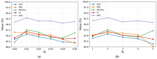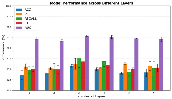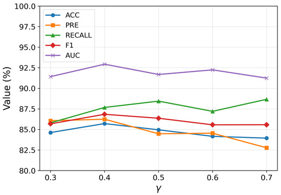 We implemented a 10-fold cross-validation approach to evaluate the efficacy of our algorithm. For performance assessment, we adopted accuracy (ACC), precision (PRE), recall (RECALL), F1 score (F1), and area under the curve (AUC) as primary metrics. The calculation methods for these performance metrics are detailed as follows: