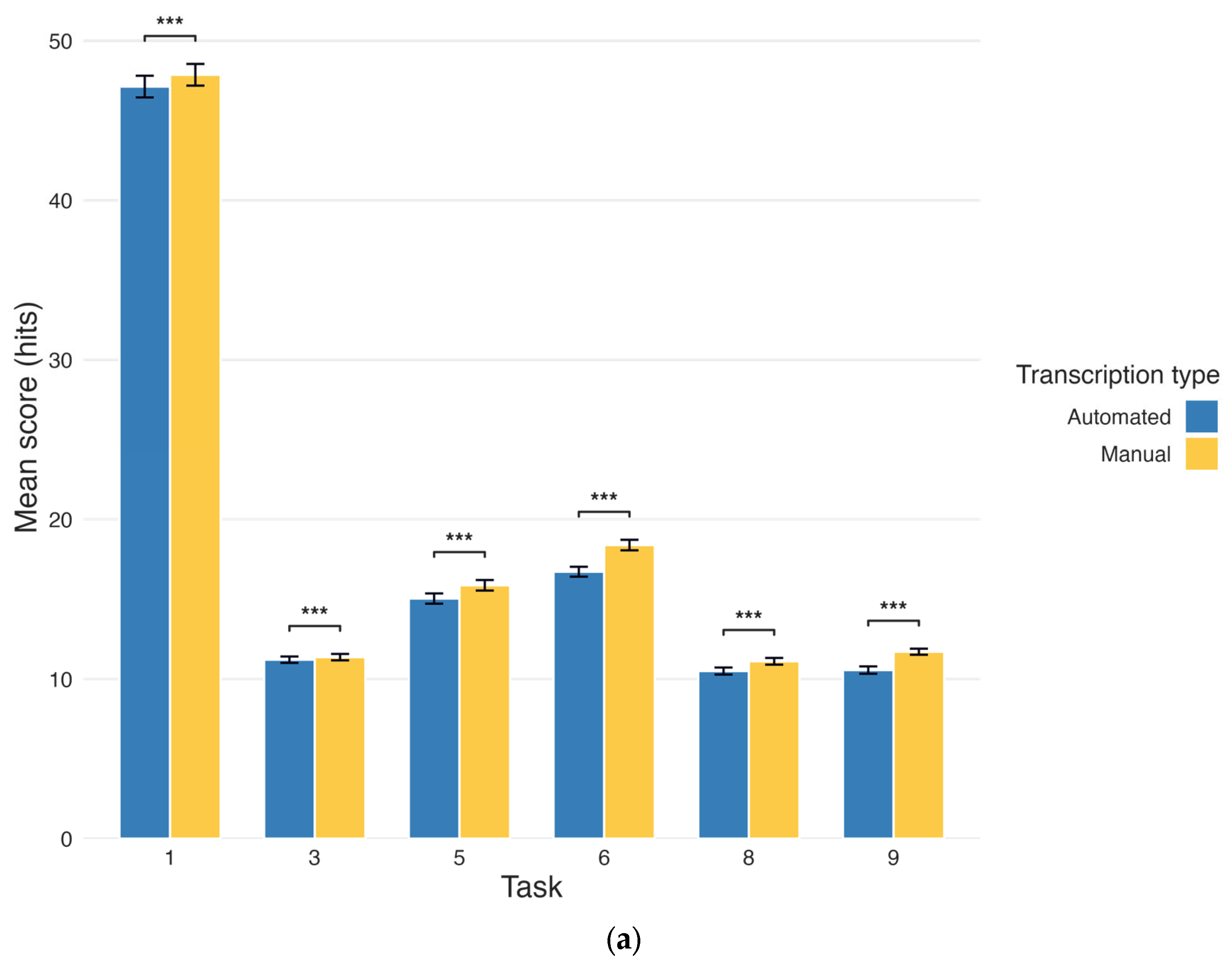 - Pfeifer, V.A.; Chilton, T.D.; Grilli, M.D.; Mehl, M.R. How Ready Is Speech-to-Text for Psychological Language Research? Evaluating the Validity of AI-Generated English Transcripts for Analyzing Free-Spoken Responses in Younger and Older Adults. Behav. Res. 2024, 56, 7621–7631. [Google Scholar] [CrossRef] [PubMed]