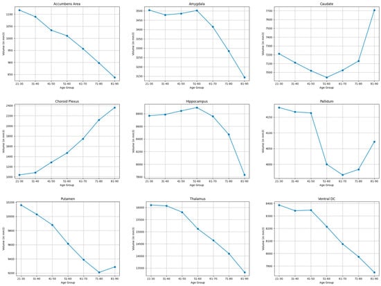 Aging is a universal process marked by profound changes in brain structure, function, and connectivity [,,]. These changes are central to understanding the neural basis of age-related cognitive decline and the heightened vulnerability to neurodegenerative diseases in older adults []. Across the lifespan, specific brain regions, such as the hippocampus, ventricles, and cortical lobes, exhibit dynamic alterations in volume and morphology, reflecting underlying neurobiological processes, including synaptic loss, myelin degradation, and cerebrovascular changes [,,]. One particular method to detail such alterations is to measure the volumetric difference in brain regions from the subjects of various age groups through imaging tools such as MRI [,]. However, even recent large-scale normative imaging studies face challenges in assembling demographically diverse datasets across the full adult lifespan, often emphasizing midlife participants and predominantly single ethnicity populations [,,].