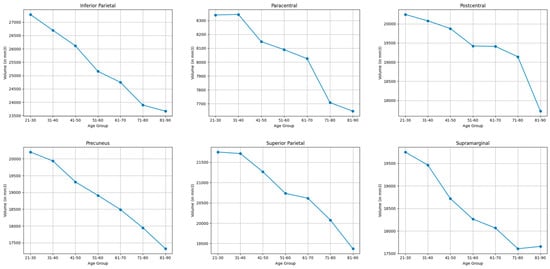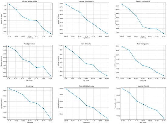 In aging populations, significant atrophy was also observed within frontal and parietal lobes integral to executive functions, spatial orientation, and sensory integration. The pars triangularis (21.5% reduction), rostral middle frontal gyrus (23.2%), and caudal middle frontal gyrus (13.7%) are critical for language processing, executive functioning, and working memory [,]. As such, their volumetric declines may contribute directly to cognitive deficits frequently observed in aging populations. Similarly, the inferior parietal lobule (14.2% reduction), involved in visuospatial processing and attention, exhibited atrophy, potentially underpinning age-related spatial and attentional deficits [,].