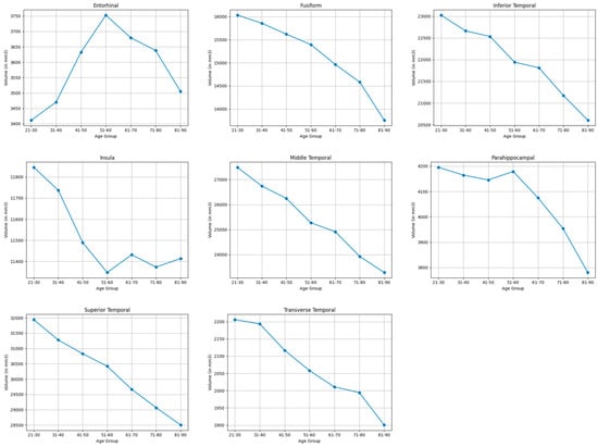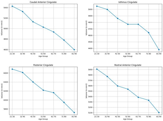 Additionally, aging populations demonstrated notable volumetric reductions in the temporal lobe structures associated with functions relating to auditory processing, including the transverse temporal gyrus (14.9% reduction) [,]. Such patterns could reflect deterioration of auditory processing speed and accuracy common in older adults [,]. Moderate declines in the cingulate cortex, particularly the caudal anterior cingulate (16.6%) and posterior cingulate (15.6%), suggest vulnerability in regions associated with emotion regulation and episodic memory retrieval, potentially contributing to subtle cognitive and emotional alterations observed in aging [,,].