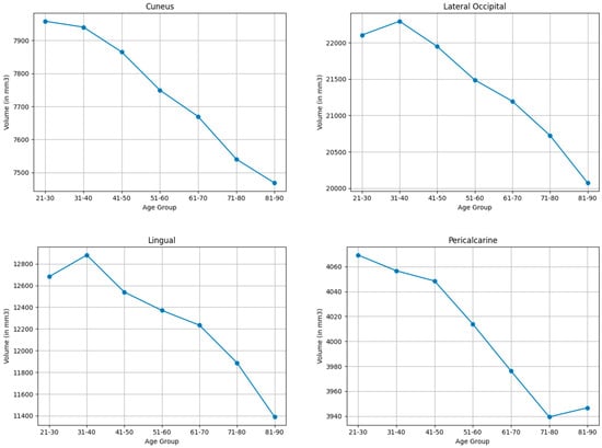 As shown in Table 3 and Table 8, and visualized in Figure 5, Volume changes in occipital regions were less pronounced than in frontal or parietal lobes. Occipital regions exhibited moderate volumetric changes in the lingual (10.7%) and the lateral occipital (9.6%). Minor shrinkages were found in the pericalcarine (2.5%) and the cuneus (6.4%).