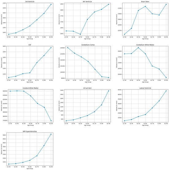 As shown in Table 3, the most drastic volumetric expansion between age ranges was the white matter hypointensities (122.6%), an area that represent areas of signal abnormality on MRI associated with reduced tissue integrity, often due to cerebrovascular pathology such as ischemic injury, demyelination, and microvascular dysfunction [,,,]. The dramatic increase observed likely reflects progressive age-related vascular damage, potentially driven by chronic hypertension, arteriosclerosis, or small vessel disease, ultimately contributing to cognitive decline by disrupting neural connectivity and efficiency [,]. Regions demonstrating similar magnitude of volumetric expansion included the inferior lateral ventricles (116.8%), lateral ventricles (115.9%), third ventricle (79.4%), consistent with results of previous studies that have attributed the enlargement to generalized parenchymal atrophy and CSF redistribution [,,]. Choroid plexus (77.8%) also showed significant enlargement with age, similar to previous studies that have attributed the correlation with compensatory hypertrophy to perfusion loss [].