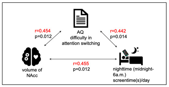 Significant correlations among NAcc volume, difficulty in attention switching, and nighttime screen time. The volume of the nucleus accumbens (NAcc), self-reported difficulty in attention switching (measured by the AQ subscale), and nighttime smartphone use (midnight–6 a.m.) were all significantly and positively correlated.