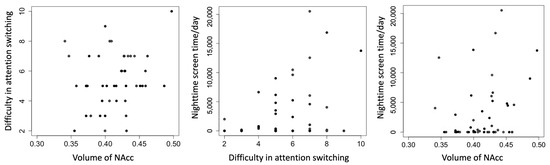 Scatterplots of difficulty in attention switching, nighttime screen time, and volume of NAcc. Each panel depicts a bivariate relationship among the three primary variables: right NAcc volume (arbitrary units, normalized to total gray matter volume), self-reported difficulty in attention switching (measured by the AQ subscale, range 0–10), and objectively logged nighttime smartphone use (seconds per day, midnight–6 a.m.). All data are plotted with raw values. Regression lines are not shown, as partial correlations were computed using Spearman’s rank correlation, which does not assume linearity. Minor differences in case numbers reflect pairwise missing data. NAcc = nucleus accumbens; AQ = Autism Spectrum Quotient.