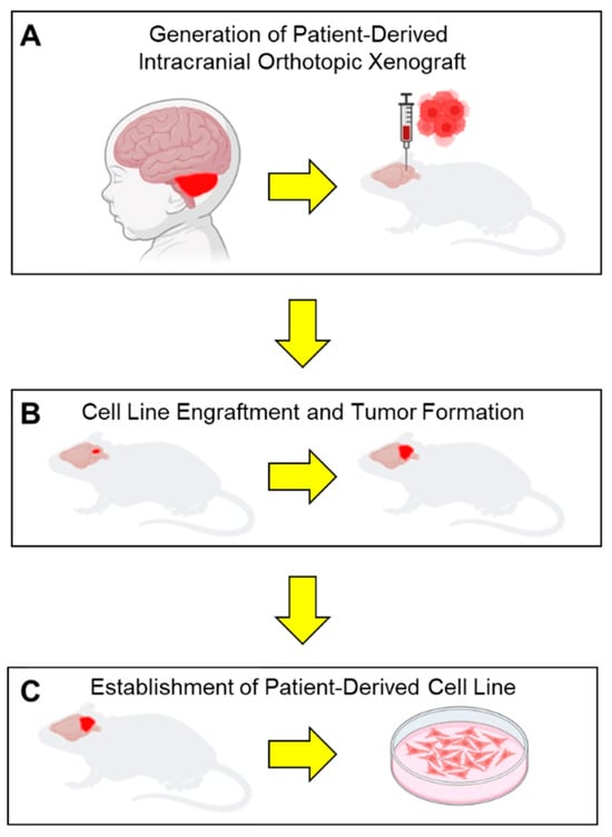Schematic workflow of establish patient-derived orthotopic intracranial xenografts and orthotopic cell lines. (A) Intraoperative brain tumor samples are directly engrafted into the cerebellum of an immunocompromised mouse. (B) Mice are monitored for signs of neurologic deficit due to tumor cell engraftment and tumor growth. (C) Tumors are explanted from mice after they succumb to their tumor burden and dissociated to generate patient-derived cell lines.