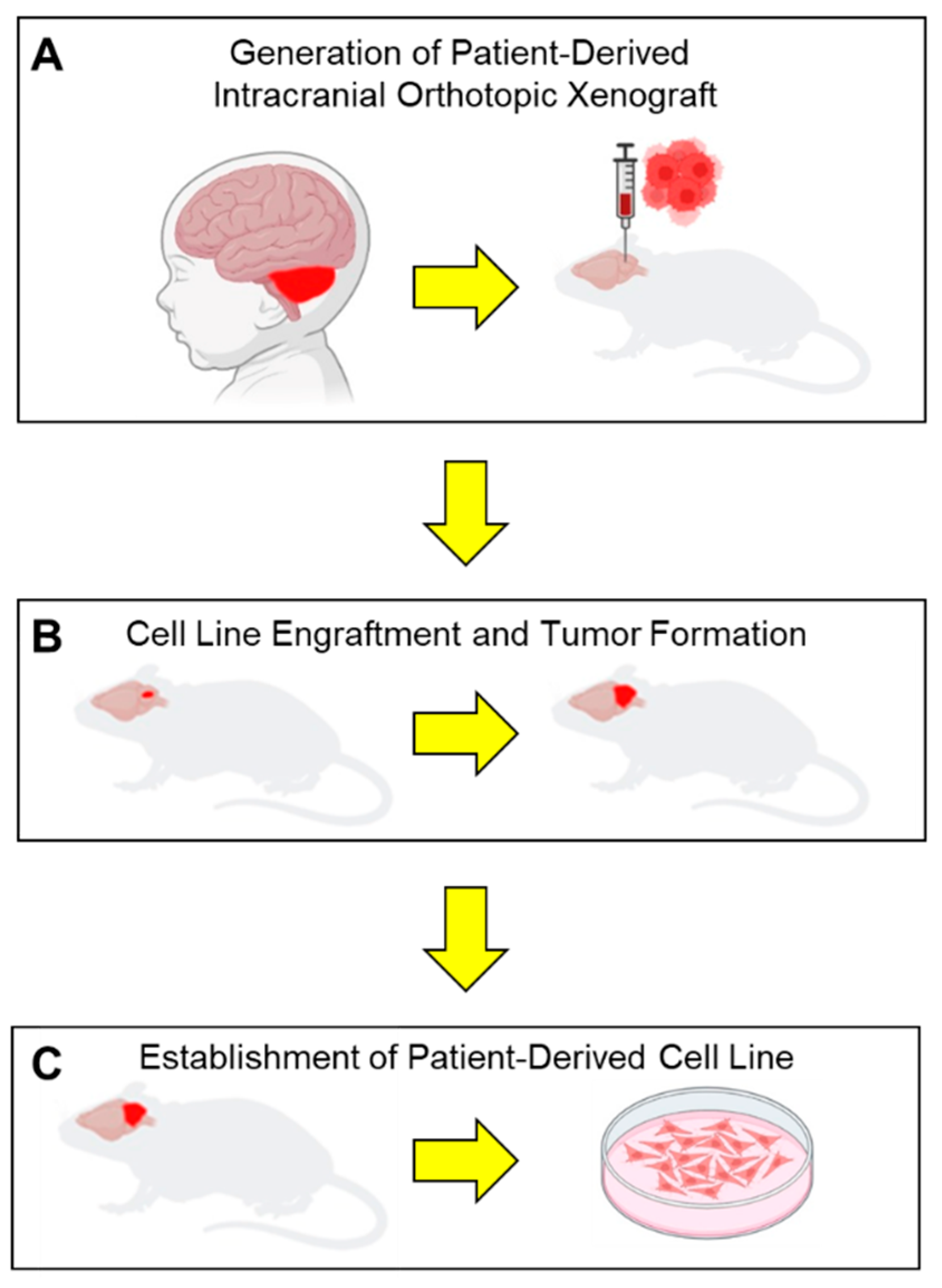 - Smith, K.S.; Xu, K.; Mercer, K.S.; Boop, F.; Klimo, P.; DeCupyere, M.; Grenet, J.; Robinson, S.; Dunphy, P.; Baker, S.J.; et al. Patient-derived orthotopic xenografts of pediatric brain tumors: A St. Jude resource. Acta Neuropathol. 2020, 140, 209–225. [Google Scholar] [CrossRef]